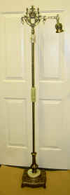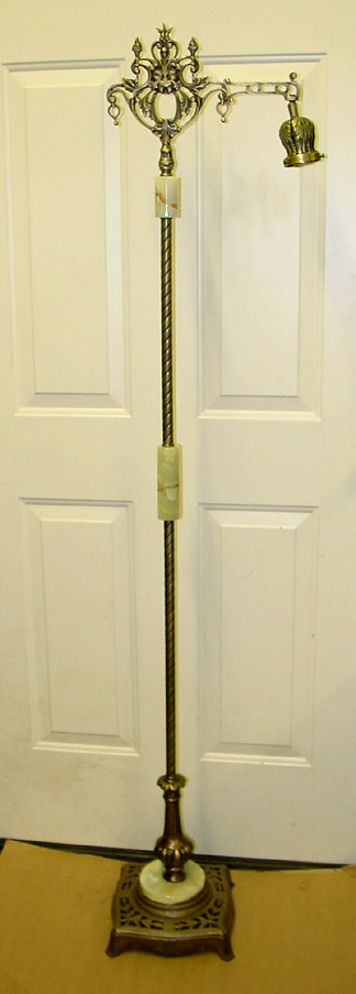| Antique Square Base: Vintage base (unknown metal content - brass or bronze) New reproductions of original antique pattern components as follows: "North Wind" brass bridge arm, new brass Husk Holder for glass shade (not required if using standard Uno-threaded lampshade); Brass Swivel; 3/4-inch "Rope" brass tubing, and turned solid brass seating rings. All these components have hand-applied antique finish, except base - it has original finish. Genuine Onyx 5" Cylinder in center; 5" Genuine Onyx Flat Round break at bottom Cast metal with antiqued finish "Genie Bottle" Column Includes a 12-foot or 16-foot UL approved cord (brown, black, white, gold, or silver) Socket: Deluxe Brass 3-way Turn-knob (as used here) antique finish. (This style socket is usually used when glass shades are used.) For a fabric or styrene shade, you might want a Deluxe antique brass finish Pull-Chain, in which case you would not need the Husk Holder. A uno-fitter shade will thread onto the end of the threaded socket.) All sockets we sell are UL listed and approved. This configuration stands approximately 63" tall. Lamp has a 54" long center pipe (1/4 IP), and the North Wind bridge arm is 8-1/2" tall. There is approximately 1 inch between the floor and where the pipe screws into the base. Height of the lamp is determined by the length of the center pipe, available in one-inch increments from 42" to 60".