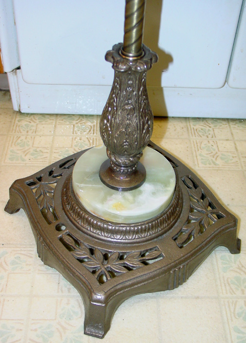 Antique Square Base: Brass-plated Iron, with antiqued finish New reproductions of original antique pattern components as follows: "North Wind" brass bridge arm, new brass Husk Holder for glass shade (not required if using standard Uno-threaded lampshade); Brass Swivel; 3/4-inch "Ivy" Embossed brass tubing, and turned solid brass seating rings. All these components have hand-applied antique finish. Genuine Onyx Donut in center; 5" Genuine Onyx Flat Round break at bottom Cast metal with antiqued finish "Leaf" Column Includes a 12-foot or 16-foot UL approved cord (brown, black, white, gold, or silver) Socket: Deluxe Brass 3-way Turn-knob (as used here) antique finish. (This style socket is usually used when glass shades are used.) For a fabric or styrene shade, you might want a Deluxe antique brass finish Pull-Chain, in which case you would not need the Husk Holder. A uno-fitter shade will thread onto the end of the threaded socket.) All sockets we sell are UL listed and approved. This configuration stands approximately 63" tall. Lamp has a 54" long center pipe (1/4 IP), and the North Wind bridge arm is 8-1/2" tall. There is approximately 1 inch between the floor and where the pipe screws into the base. Height of the lamp is determined by the length of the center pipe, available in one-inch increments from 42" to 60".