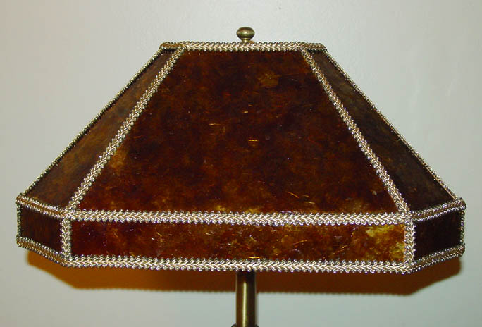 Amber Mica on Hexagon uno frame trimmed with spun brass braid, for bridge lamp
