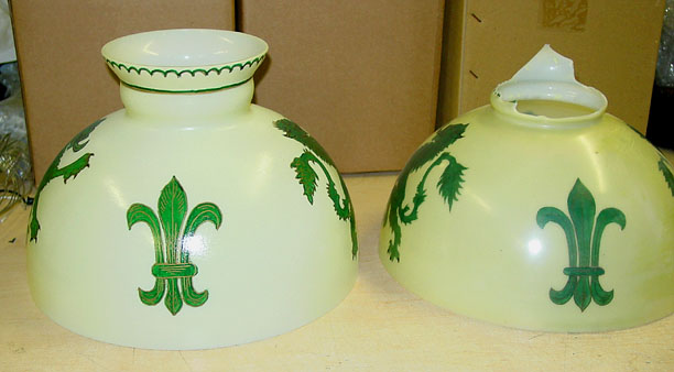 If you know of, or can find an artist in your area, we can furnish plain shades in several styles and sizes that can be painted to match your lamp shade or font. We do not manufacture the glass shades, but the ones we sell are Made in America!