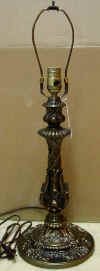 One-piece cast metal, antique brass finish, 13" tall from table top to top of lamp socket; #7 harp