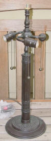 Copy of original Tiffany design, 3-pull chain socket cluster, 23" tall to top of shade rest. Dark bronze color with green patina finish. Excellent for reverse-painted dome shades or stained-glass shades.